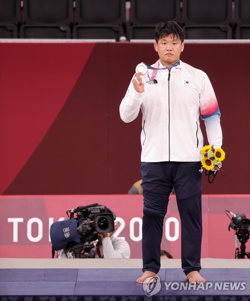 | ▲ Cho Guham of South Korea holds up his silver medal from the men's 100kg judo event at the Tokyo Olympics at Nippon Budokan in Tokyo on July 29, 2021. (Yonhap) |