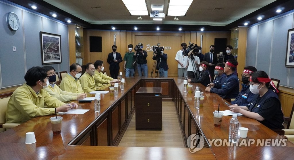 | ▲ Officials from the transport ministry and representatives from the Cargo Truckers Solidarity attend a meeting in Uiwang, Gyeonggi Province, on June 14, 2022. (Yonhap) |