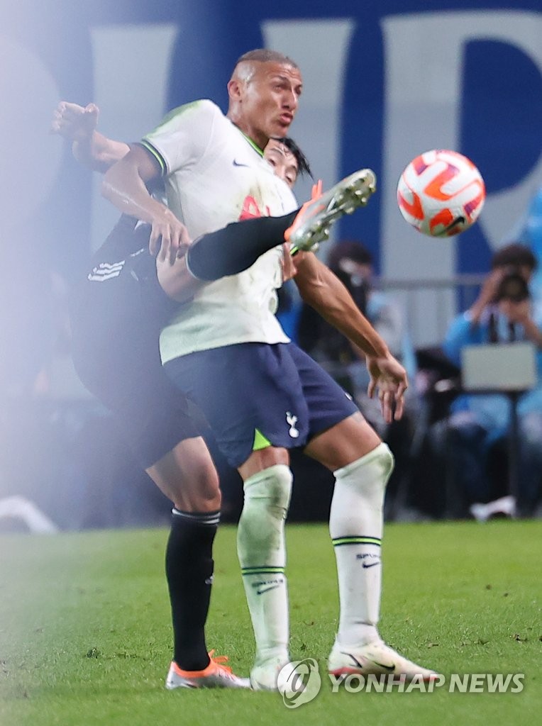 | ▲ 팀 K리그 수비에 묶인 히샤를리송 (서울=연합뉴스) 김도훈 기자 = 13일 서울월드컵경기장에서 열린 팀 K리그와 잉글랜드 프로축구 프리미어리그 토트넘 홋스퍼의 친선경기에서 토트넘 히샤를리송이 팀 K리그 수비에 묶여 있다. 2022.7.13 superdoo82@yna.co.kr |