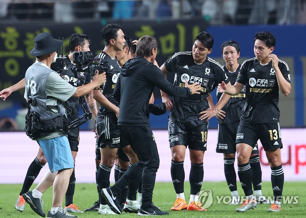 | ▲ 팀 K리그와 인사하는 콘테 감독 (서울=연합뉴스) 김도훈 기자 = 13일 서울월드컵경기장에서 열린 팀 K리그와 잉글랜드 프로축구 프리미어리그 토트넘 홋스퍼의 친선경기가 끝난 뒤 토트넘 콘테 감독이 팀 K리그 선수들과 인사하고 있다. 2022.7.13 superdoo82@yna.co.kr |