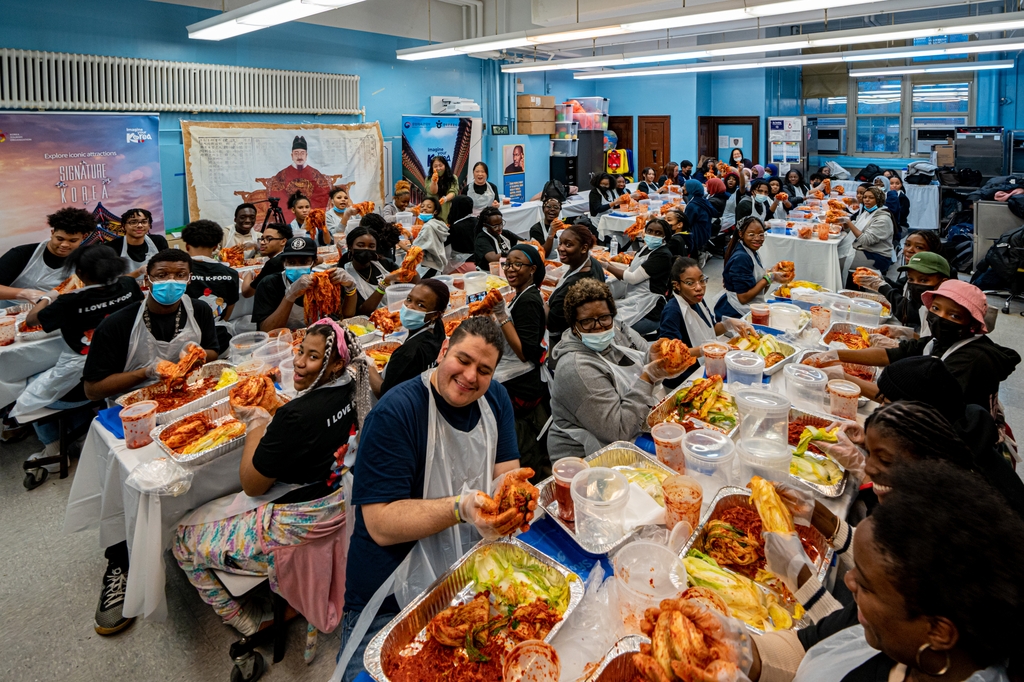 (뉴욕=연합뉴스) 강건택 특파원 = 뉴욕한국문화원은 한국관광공사 뉴욕지사와 공동으로 지난 20일(현지시간) 미국 뉴욕시 공립학교인 '데모크라시 프렙 할렘' 고등학교 학생 50명을 대상으로 전통 김치 담그기 체험 행사인 '(렛츠 메이크 김치 투게더!'(Let's Make Kimchi Together!)를 개최했다고 21일 밝혔다.