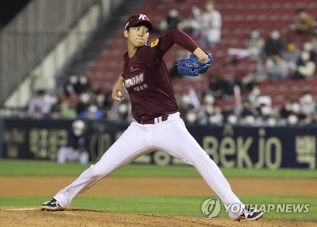 | ▲  An Woo-jin of the Kiwoom Heroes pitches against the Doosan Bears during the Korea Baseball Organization wild card game at Jamsil Baseball Stadium in Seoul on Nov. 1, 2021. (Yonhap) |