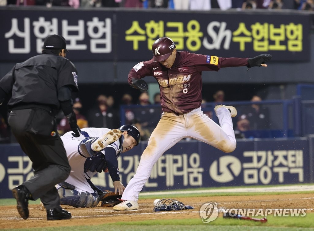 SEOUL, Nov. 1 (Yonhap) -- The Kiwoom Heroes defeated the Doosan Bears 7-4 in a South Korean baseball wild card thriller on Monday, scoring three runs in the top of the ninth inning to stay alive for another day.