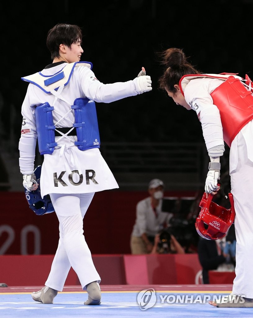 | ▲ Lee Da-bin of South Korea (L) gives a thumbs-up sign to Milica Mandic of Serbia after losing to Mandic in the final of the women's +67kg taekwondo event at Makuhari Messe Hall A in Chiba, Japan, on July 27, 2021. (Yonhap) |