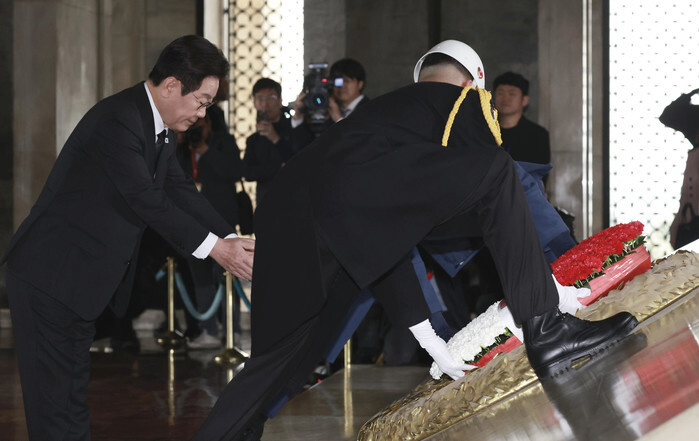President Lee Jae Myung (L) lays a wreath at the mausoleum of Mustafa Kemal Ataturk, the founder and first president of Turkey, in Ankara, Turkey, on Nov. 24, 2025, during his state visit to the country. (Yonhap)