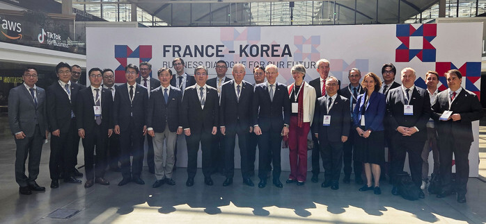 Business leaders from South Korea and France pose for a group photo during the 2nd Korea-France Future Dialogue co-hosted by the Federation of Korean Industries (FKI) and the Movement of the Enterprises of France (MEDEF) at Station F, the world's largest startup campus located in Paris, on May 20, 2025, in this photo provided by the FKI. (PHOTO NOT FOR SALE) (Yonhap)