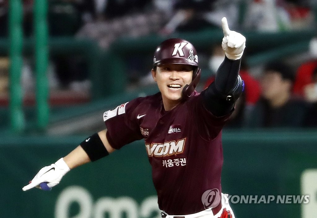 | ▲ Lee Ji-young of the Kiwoom Heroes celebrates his RBI single against the SSG Landers during the top of the sixth inning of Game 1 of the Korean Series at Incheon SSG Landers Field in Incheon, 30 kilometers west of Seoul, on Nov. 1, 2022. (Yonhap) |