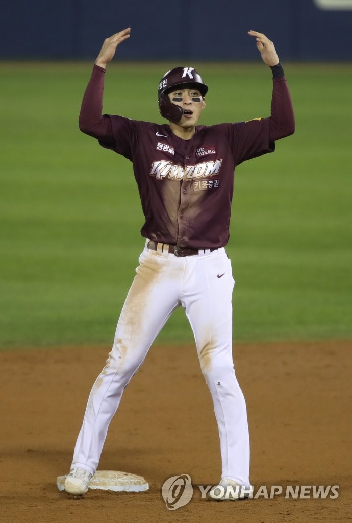 | ▲  Lee Jung-hoo of the Kiwoom Heroes celebrates his two-run double against the Doosan Bears in the top of the ninth inning of the Korea Baseball Organization wild card game at Jamsil Baseball Stadium in Seoul on Nov. 1, 2021. (Yonhap) |