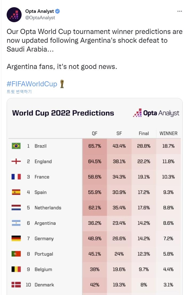 축구 기록 전문 매체 옵타가 22일(한국시간) 업데이트한 우승 순위를 보면, 아르헨티나의 우승 확률은 종전 12.6%에서 8.6%로 4% 포인트 낮아졌다.