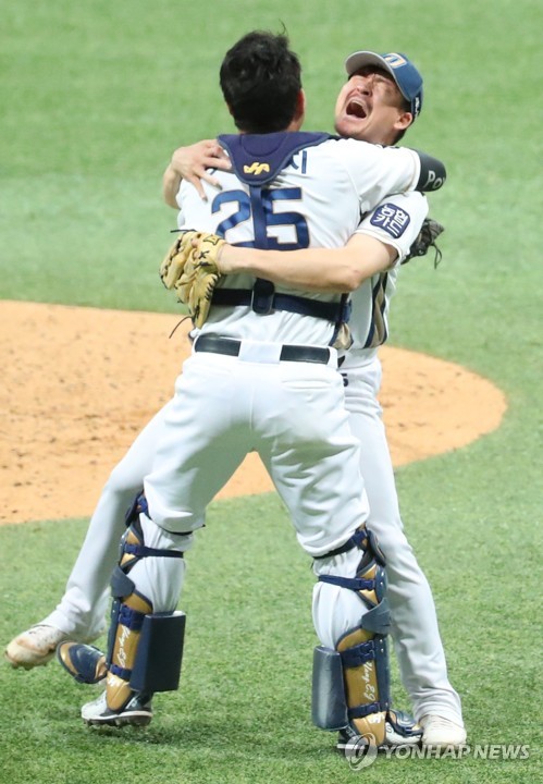 | ▲ NC Dinos' catcher Yang Eui-ji and closer Won Jong-hyan celebrate their a 4-2 victory over the Doosan Bears in Game 6 at Gocheok Sky Dome in Seoul on Nov. 24, 2020. (Yonhap) |