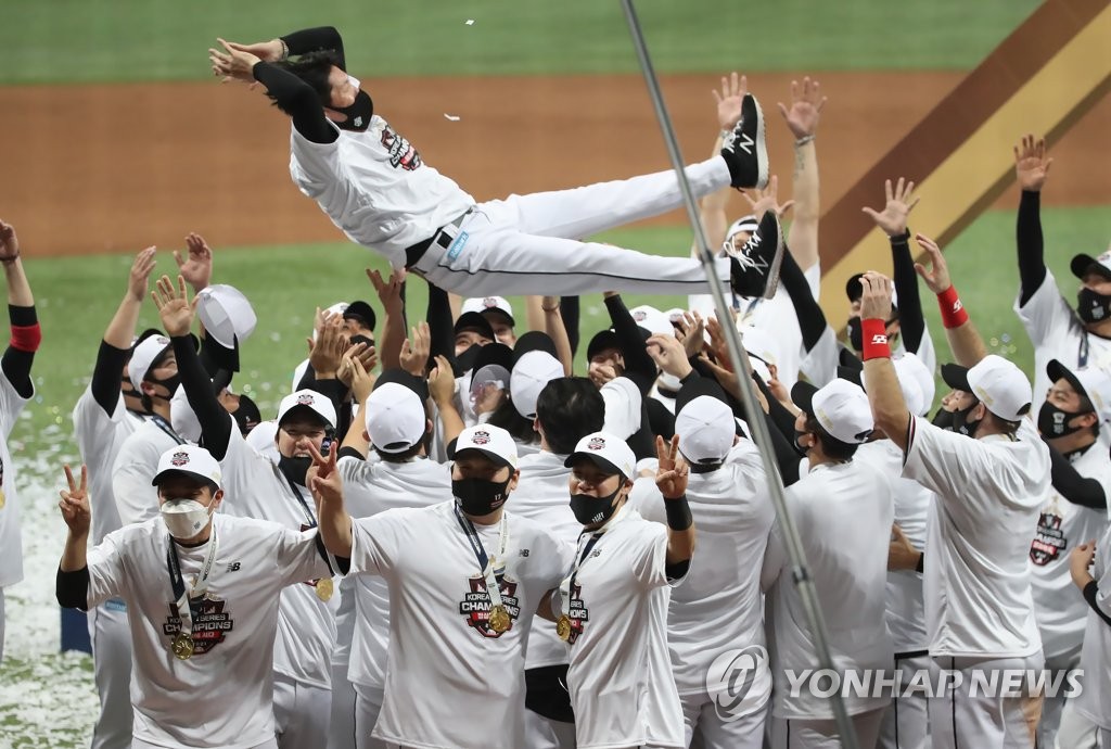 | ▲  KT Wiz players toss their manager Lee Kang-chul in the air to celebrate their Korean Series title after defeating the Doosan Bears 8-4 in Game 4 at Gocheok Sky Dome in Seoul on Nov. 18, 2021. (Yonhap) |