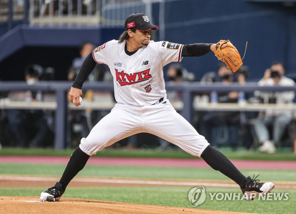| ▲  KT Wiz starter William Cuevas pitches against the Doosan Bears during the top of the first inning in Game 1 of the Korean Series at Gocheok Sky Dome in Seoul on Nov. 14, 2021. (Yonhap) |
