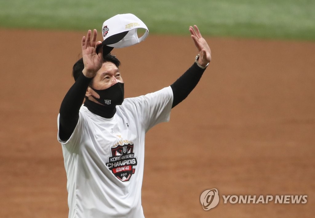 | ▲  KT Wiz manager Lee Kang-chul waves to fans after winning the Korean Series title with an 8-4 victory over the Doosan Bears in Game 4 at Gocheok Sky Dome in Seoul on Nov. 18, 2021. (Yonhap) |