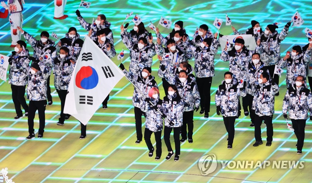 | ▲ South Korean athletes and officials enter the National Stadium in Beijing during the opening ceremony for the 2022 Beijing Winter Olympics on Feb. 4, 2022. (Yonhap) |